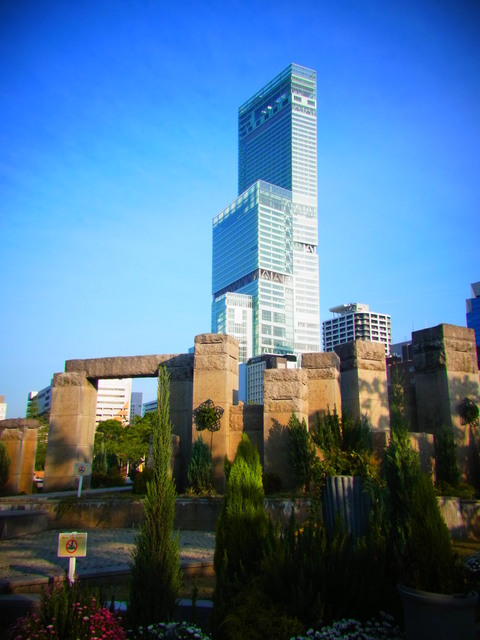 阿倍野ハルカスと鳥の楽園の上に巣が~