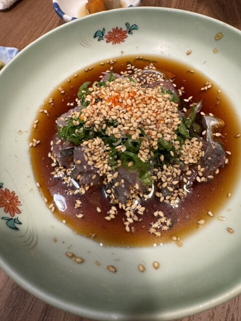 シャコ酢、イカゲソ、サワラのたたき。アジの胡麻和え。