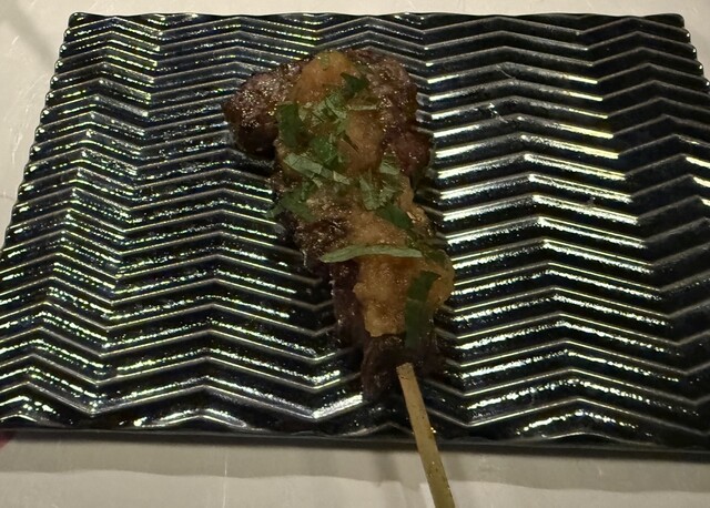やきとり1本目は胸肉の振袖。 初めての肉の部位。適度に脂が乗ってふっくらジューシーで美味い。