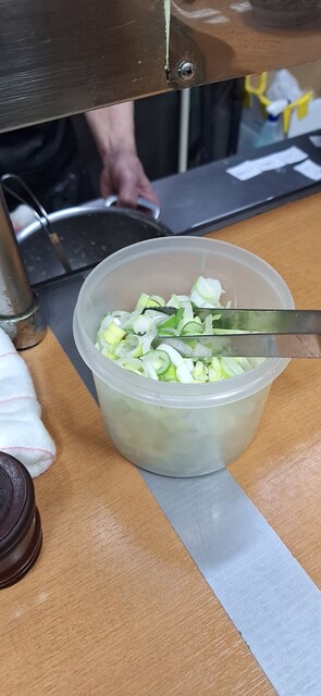 わかめをきれいに整えて、入れ放題のネギを入れて、七味を掛けます。