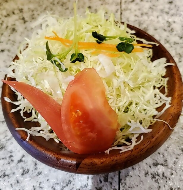 千切りキャベツはいつもはドレッシング掛けるのだが、今回はちょいと掛けて