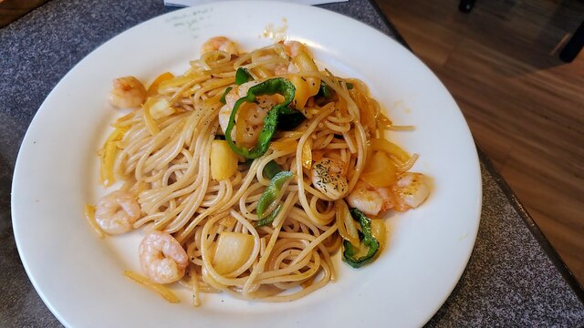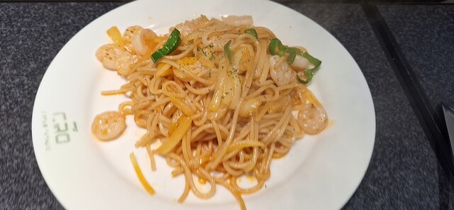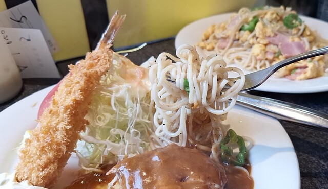 ハンバーグ&エビフライに添えられた塩味のスパゲティには玉ねぎとピーマン。コショウも効いてます。