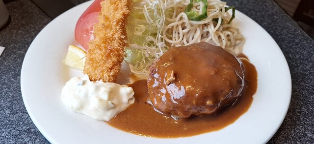 サーモンフライの次はハンバーグとエビフライを。懐かしい♫