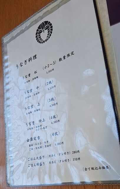 うな重は松@3,300・中@3,520・上@4,940・特上@6,380・白蒲定食@6,380(全て税込)など。