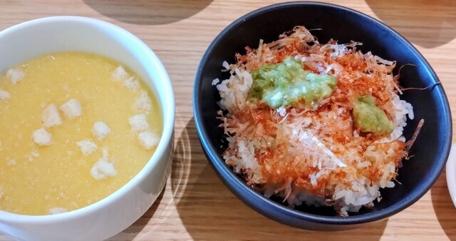 ご飯に鰹節とわさびを乗せてお醤油少々