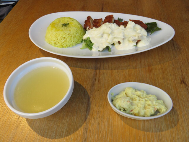 こちらのスープは私的には絶品です。レモン塩がさっぱりとして、飲みやすく、野菜も入っているのでヘルシーですよ。私は一人だと2杯はお代わりしちゃいます。で、今までは付け合わせの小鉢は、特製のラタトゥーユの時が多かったと思うが、この日はポテサラでした。それにプレートにサラダ、ライスとメインのサルサチーズのかかったひな鶏です。サラダにはたっぷりとドレッシングがかかっており、なぜかご飯との相性も良いのです。ひな鶏はしっかりと味が乗っており噛むととても柔らかく食べやすいが、噛んでいるとそれなりにジューシーである。サルサとチーズに合ってるし、酸味の効いたスープとの相性も良いと思う。