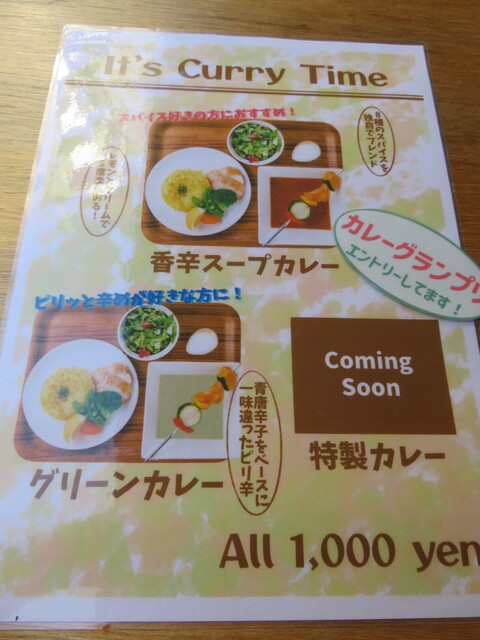 前回もカレーをいただいたが、檸檬食堂オリジナル香味スープカレーだったので今回はグリーンカレー@1000円(税込み)を発注。なお、ライスは前回普通盛で少なく感じたので、大盛りでお願いする。