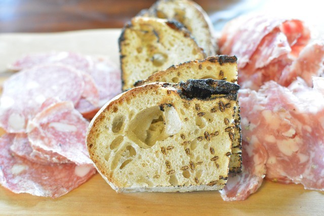 トスカーナのサラメ、イノシシのサラメ、Forno a legna Panezza製パンの炙り