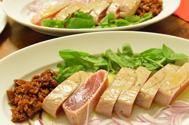 ・ブロードを取った後の鶏とルーコラセルバチカ(つくば市今鹿島で若い女性が1人でヨーロッパ野菜作りに励んでいる。とても力強い味でどっちが主役か分からないほど)ドレッシングにはデーツ(ナツメ)を使った酢(バルサミコのようなもの)