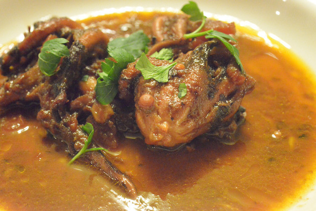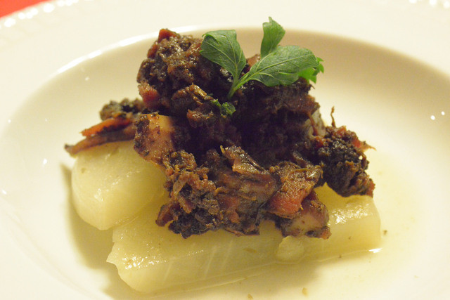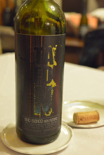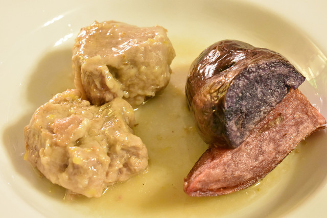 鶏肉の猟師風煮込みと言えば、ボローニャやトスカーナのトマト煮らしいですが(合ってます?)シチリアではちょっと違うそうです。で、ゴッドファーザーに出てくる料理の再現か何かの機会があり、シチリア在住の大下さんに地元のマンマに教わったというこの料理。鶏肉を丸一日赤ワイン(しかも、美味いヴィナイオータ扱いのワイン)に漬け込み、オレガノと塩だけで何時間も煮込んだそうです。噛み応えあれどほろっと解け、口の中に旨味が広がります。また一つ記憶に残るお料理に、思い出すだけで( ̄¬ ̄*)こんな顔。