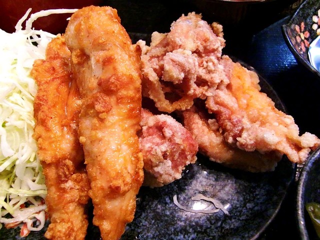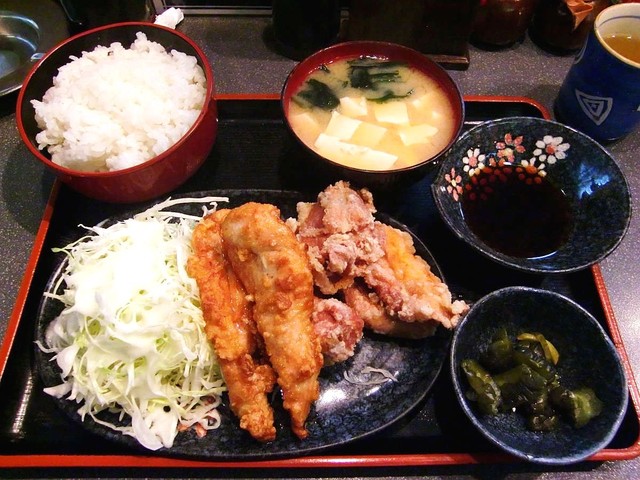 今回頂いた "唐揚げ定食 900円" には、皮パリパリ、中身ジューシーの手羽先などの鳥唐揚げが山盛りで、余りに多いので大食漢の同行者に一つプレゼント。