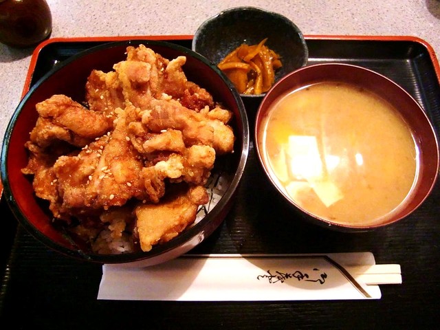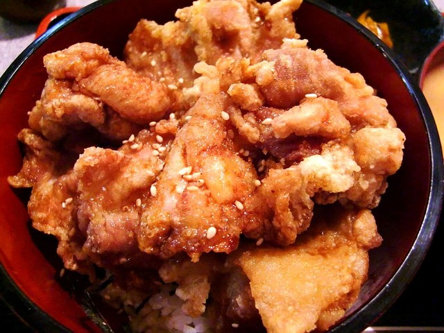 ポン酢醤油にさっと潜らせた、周りはサクッと・中はジューシーな鶏の唐揚がたっぷり、刻み海苔がトッピングされた美味しい御飯の上に盛り付けられていて、きじ丼同様にボリュームと美味しさが味わえる名品ですね。