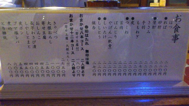寄せ豆腐の突出しから始まり、最初はたれ焼きのつくね・れば・背肝(腎臓)・ししとう、次は塩焼きのささみ・首肉・砂肝・はつで〆というコースです。