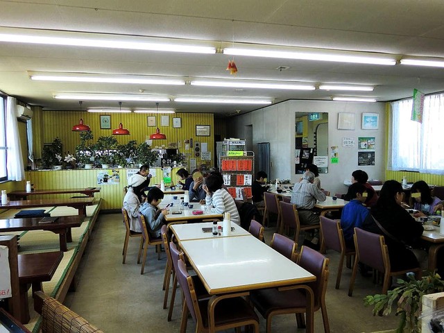 広い駐車場に車を停めてお店に入ると、左側が特産品などの物販スペースで、右側にテーブル10卓と小上がり座敷に4卓が配置され、大人数の家族などで訪れても充分な広さ。