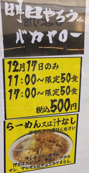ワンコインで「二郎」風デカ盛りラーメン 「明日やろうはバカヤロー」