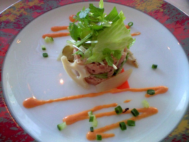 ミンチされたマグロとソース、そして酸味で調理された野菜が添えられています。