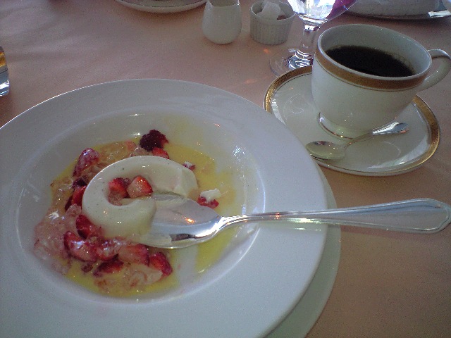 デザートとコーヒー ココナッツのブランマンジェと苺のジュレ寄せ