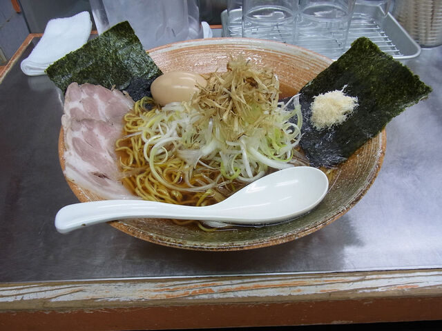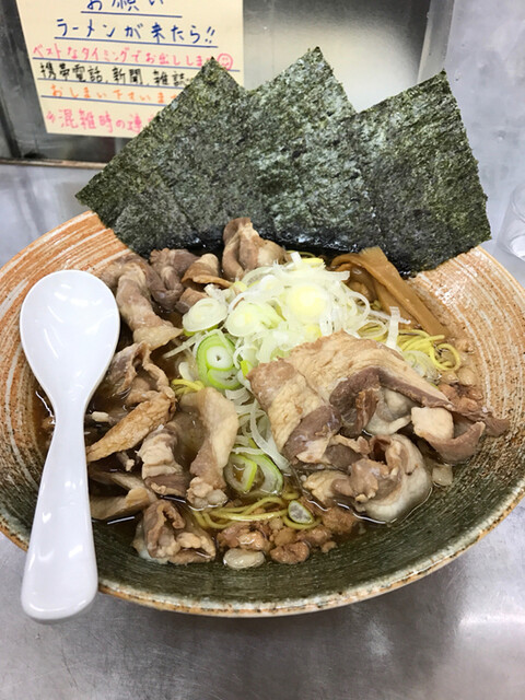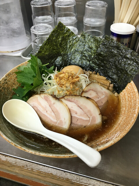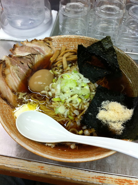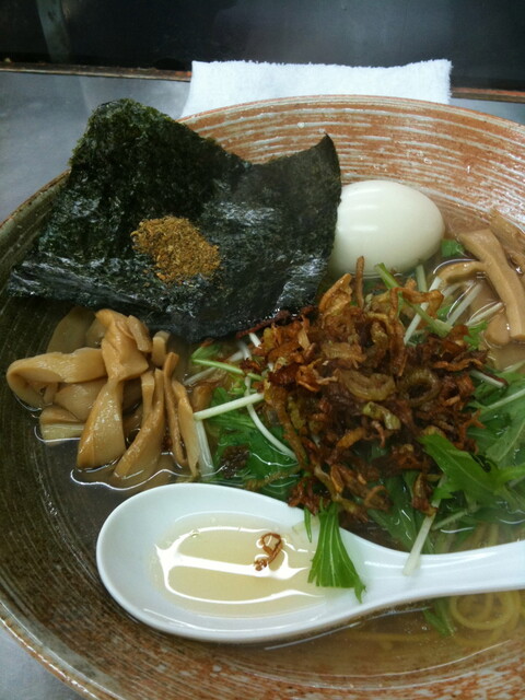 土曜日だけど、正統派正油ラーメン(覆麺)バージョンUPだそうな。牛骨 豚骨 鶏 平子煮干し ホタルいか煮干し 魚介類出汁で濃口か薄口正油が選べるとのことで、迷わず濃口醤油。