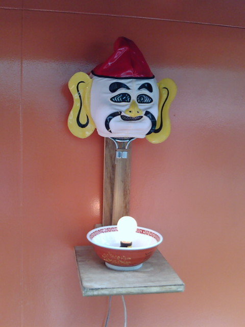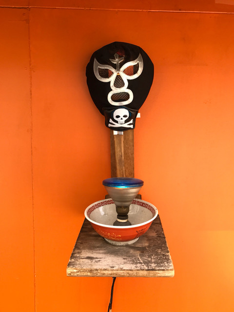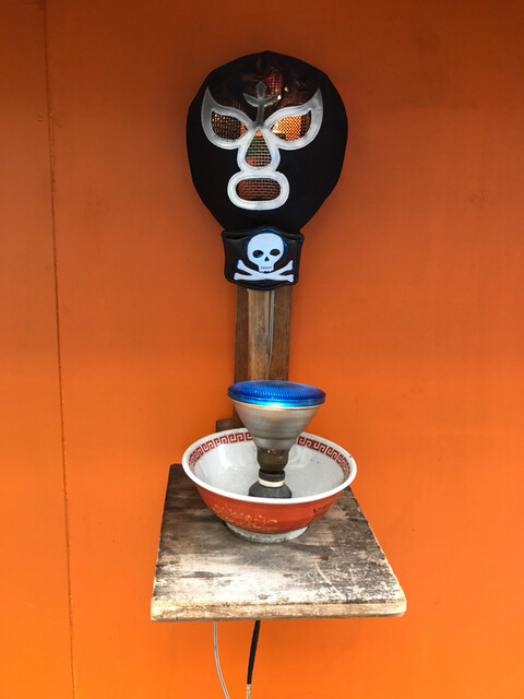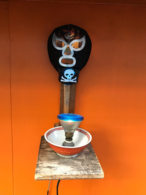 入り口横には怪しく光る覆面が!って、入り口横で覆面レスラー・・・店員が休憩しとった(笑)