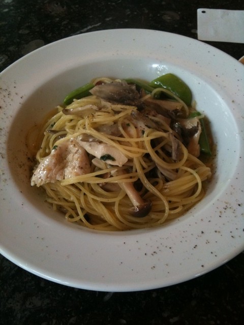 ササミとキノコとサヤエンドウのペペロンチーノ
