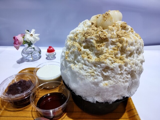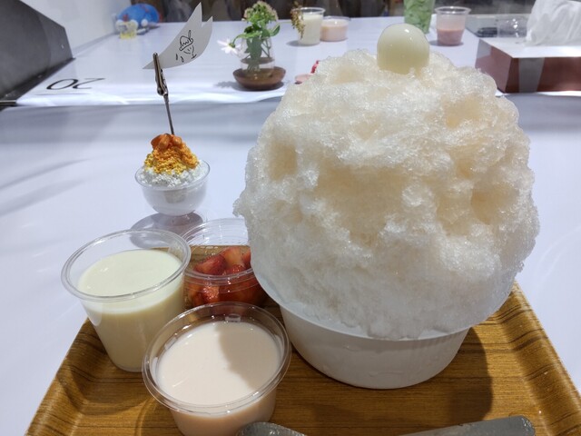ココナッツ練乳、つぶ餡、黒蜜が添えられています。最高。