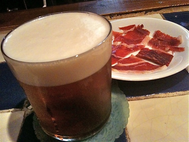 琥珀ビール(中)とハモンイベリコベショータ。とろける脂の旨味が絶品。