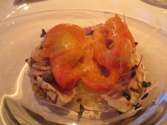 「千葉産もちカツオ」のタタキの上に、中をくりぬいてシャーベットにした石川農園のトマト。