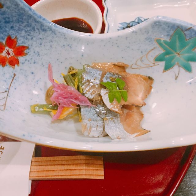 魚介のみぞれ和え、ソラマメ葛和え、穴子八幡巻き、野菜博多マリネ、小袖昆布の美しい前菜が並びます。