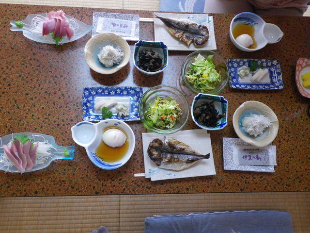 サラダ、ひじき煮、かまぼこ、わさび漬け、温泉卵、鰺の開き、しらすおろしとすべてが塩分薄味で良かった。