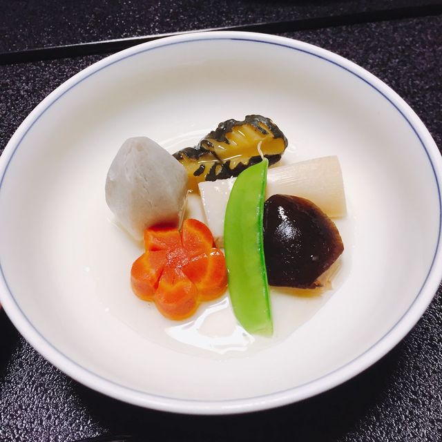 魚介のみぞれ和え、ソラマメ葛和え、穴子八幡巻き、野菜博多マリネ、小袖昆布の美しい前菜が並びます。