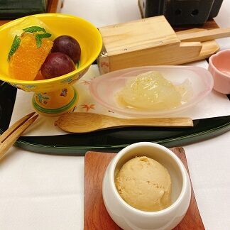 デザートはりんごのコンポート紅茶ジュレ、ブドウ、メロン、丹波黒豆のアイスクリームです。