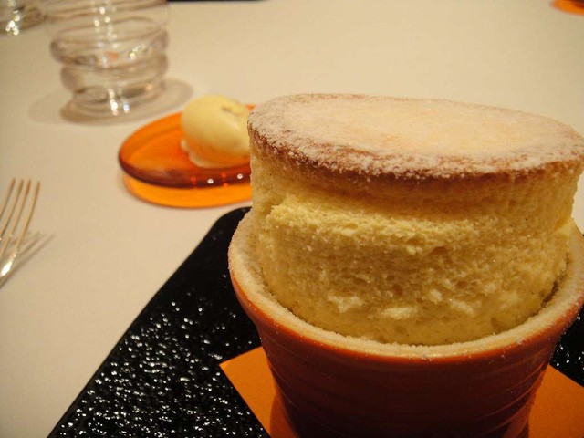 オレンジのスフレ、マンダリン・アンペリアル風味。ラムレーズンのアイスクリーム。シェフのスペシャリテ。マンダリン・アンペリアルというリキュールをふんだんに用いた、満足度の高いスフレ。