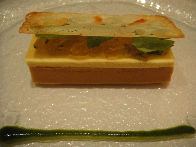 じゃがいもとフォアグラのテリーヌ。幾重にも層になった見た目からして楽しい作り。アミューズにするにはもったいないほどです。