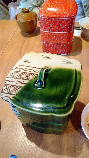 陶器の3段のお重の各段には彩り良い料理が詰まっている。宿儺南瓜、冬瓜などの旬の食材を使った料理は季節感を醸しだす。鰤の焼き物は脂の旨さが立つ。汁物は出汁の旨さが立つ。全ての料理が旨い。