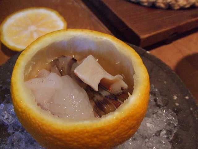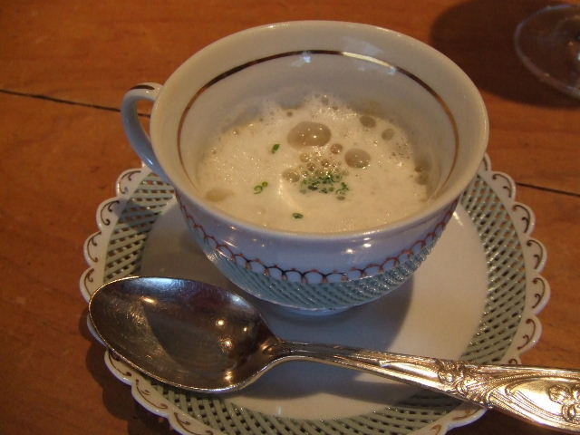 2度もお店に電話してしまって、あきれられちゃったかな?こちらは1階、私たちは2階に通されました。2階はカウンターのみのお席となっていました。この日は7000円のコースをお願いしていました。まずはシャンパンで乾杯。オードブル。半分に切られたパプリカの中にエビ・いくら・サーモン・かにときれいに盛られています。器になったパプリカを食べようとした人が、誰とは言いませんがいます^^;ちょうどコーナーのお席だったので、3人で会話するにはとてもよかったです。ひいらぎの葉がクリスマスらしさを演出しています。竹の皿となっています。3倍速kazuちゃんのパンです。このパンがとてもおいしくって、結局3人で食べていました(^^)kazuちゃんには、おかわりしてもらいました。私とみっちゃんはライスカレーを選びました。パンか、ライスカレーか、ライスと3種類から選べました。ライスカレーはメインのお肉と共に出ました。2皿目は、かぶのサラダです。上には確か貝柱が乗っていたとおもいます。さっぱりとしたドレッシングでした。3皿目はサーモンと山芋に茗荷とアクセントにいちぢく、赤いものは、トマトではありません。苺です。苺がとても合います。黒い短冊のものはなんだったかな。この時期に茗荷がいただけてうれしかったです。柚子系のソースだったかな。赤ワインをおかわりして、楽しい時間はすぎていきます。4品目は、魚介類の石焼です。柚子の器がかわいいですね。柚子の中には、鮑・エビ・いかと入っています。が、私の器の中には鮑が入っておりませんでしたので、ないことを伝えました。友人があわび〜♪と喜んでいたので発覚したのです。言われなければ、きっと鮑はないものと思っていたのですから。。後に、同じ器に鮑だけ入ったものが出されました。鮑の怨念。。じゅるるるる〜〜〜〜〜。5品目は、魚料理。ソテーしてあります。この魚の名前がとてもめずらしいものだったので、記憶できると思ってましたら、大間違いで、3人の誰ひとりとして覚えていませんでした。なっさけないなぁ。白菜とフォアグラのスープです。カプチーノ仕立て。言われなければ、白菜もフォアグラも気がつきませんでした。おいしかったです。あら、何品目でしたっけ?わすれてます。蟹のお料理でした。パプリカソースが甘くておいしかったです。口直しの柚子のソルベ。おいし〜い。和牛のヒレステーキです。ポン酢と、にんにくソースが出されます。私はポン酢で。そして、ライスカレーです。いや〜、めずらしいです。まろやかなソースでした。デザートは選べますが、全部盛り合わせでお願いしました(^−^@)3人ともコーヒーで。それぞれのカップの柄が違いました。盛り合わせデザートです。この中で一番お気に入りは、金柑のタルトです。甘酸っぱくて最高。サンタ苺もかわいい。ココアもツリー型に振ってあります。かぼちゃのプリンもおいしい。クレームブリュレもとろとろでおいしかったです。焼き加減も最高。あ〜満足満足。
