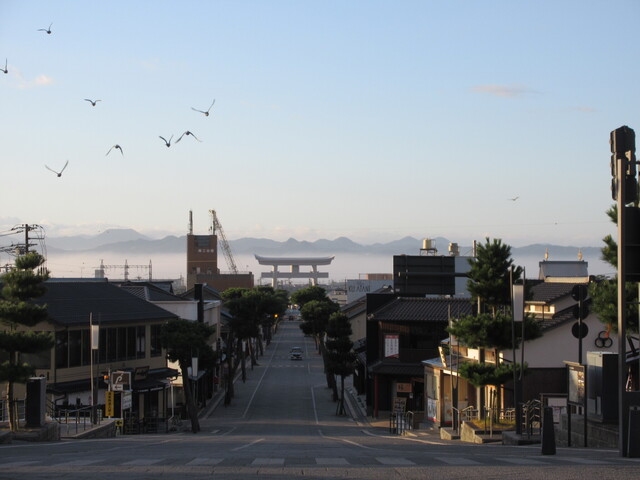 早朝、宇迦橋の大鳥居と、霧で雲海のような景色