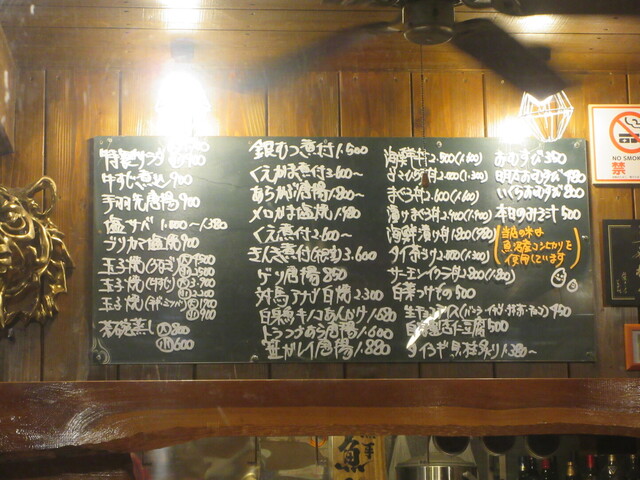 店内のカウンター席の上にある2枚の黒板メニューと手元の1冊のアルコールメニューから注文。