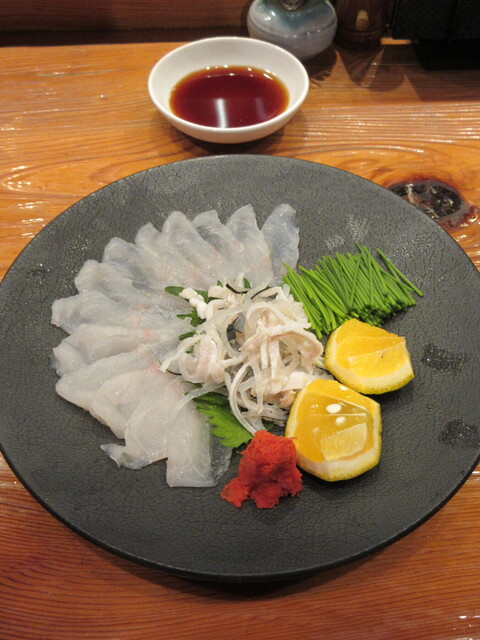 ・トラフグ刺 2800円 …冬季の楽しみ。単品でいただけるのが嬉しい。ポン酢と濃い醤油で。