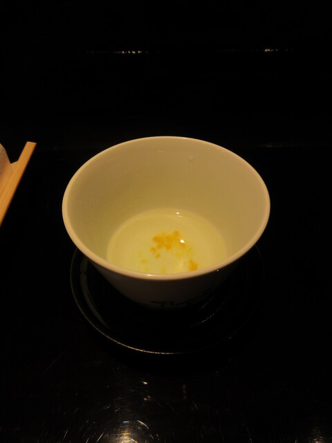 本日の先付は飯蒸し。酒蒸しのもち米の上に蒸し雲丹と銀杏。3年モノの唐墨。旨っ。