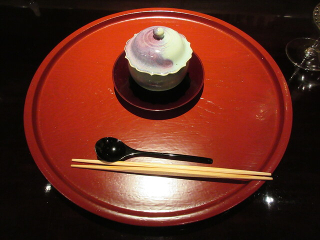 温かい付き出しを塗盆ごと受け取る。最初から良い器ですねぇ。唐津作家のもの。