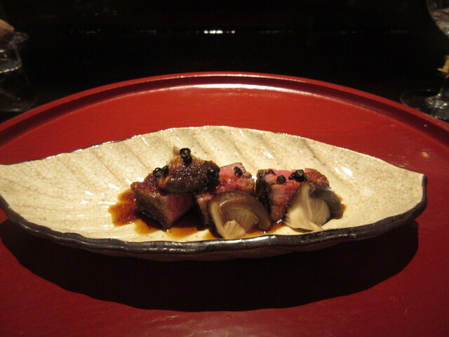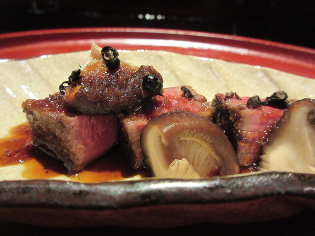 シャトーブリアン(鹿児島)、蒸した椎茸(大分)、生胡椒の塩漬け(宮崎)、リンゴと蜂蜜のタレ。