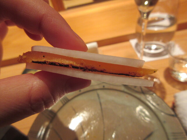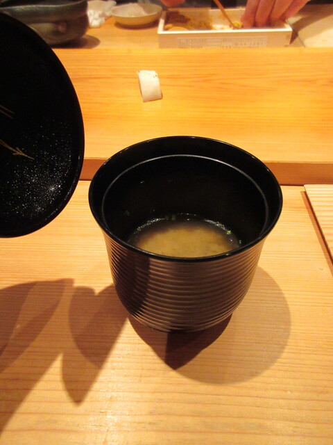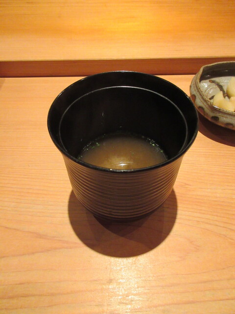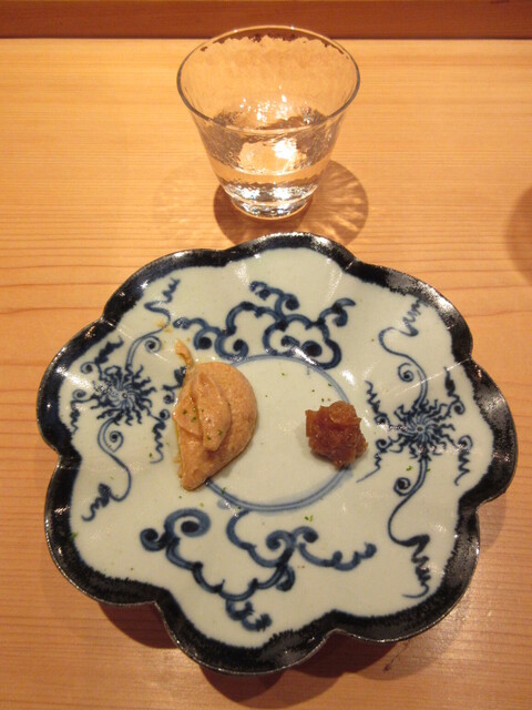 ①馬糞海胆 (北海道羅臼)、じゅんさい (青森) …醤油を少し足した出汁醤油で。ひとつめの海胆。