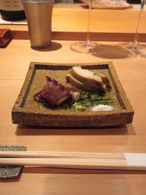 ④真蛸(長崎)、鮑(山口) …蛸は山葵と塩、鮑は山葵と塩・山葵と肝で。