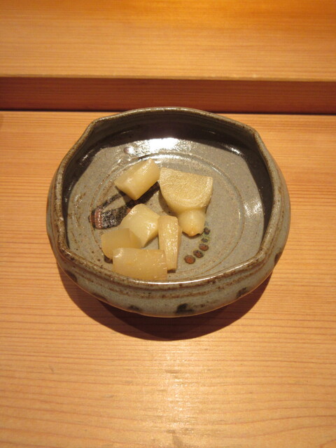 握りに入ります。ガリが用意されます。鮨さかいのガリは、新芽の柔らかい部分。
