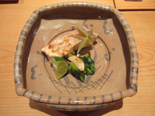 ⑧甘鯛(山口萩) …日本酒掛けながら焼き上げ、松茸のお浸し添え、酢橘。