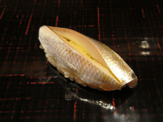 脂が温まるように高めの温度のシャリで握られる。滑らかな舌触り、脂の甘み。