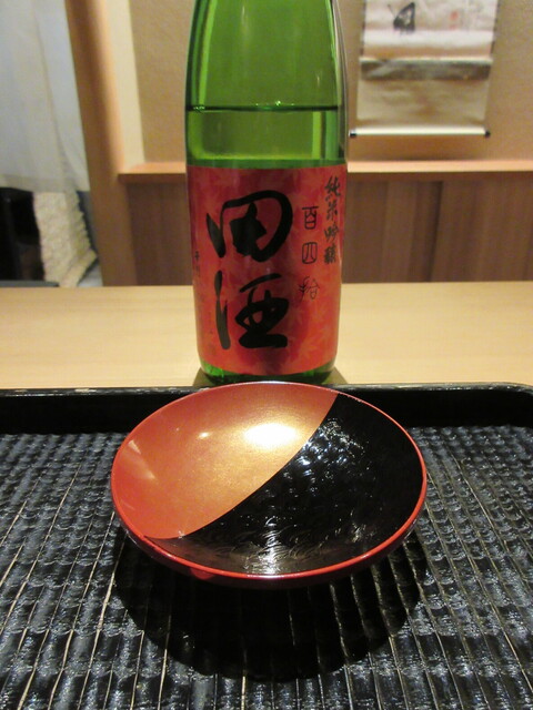手もとの杯に、店からの酒一献。田酒 純米吟醸 百四拾 紅葉ラベル(西田酒造店・青森)。