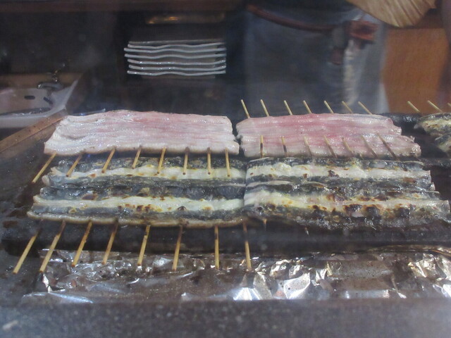 備長炭で焼かれていく鰻串
