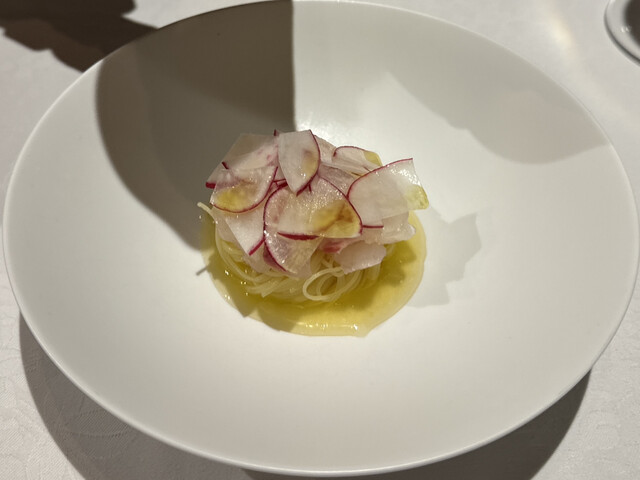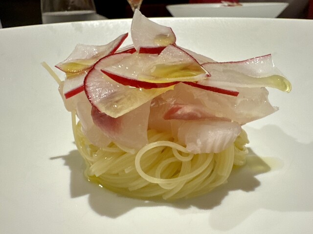 真鯛のカルパッチョは甘夏を使ってカッペリーニで仕立ててある。
