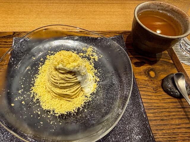 この紅玉も絶品ですよね。何度か食べたことありますが合わせるフルーツで一番好きかも。最後はモンブランデセルです。昨年のモンブラン大会の笠間代表になり見事優勝されたモンブランデセルは絶品ですよね。合わせる茎ほうじ茶も絶品です。目の前で作るモンブランはエンタメです。